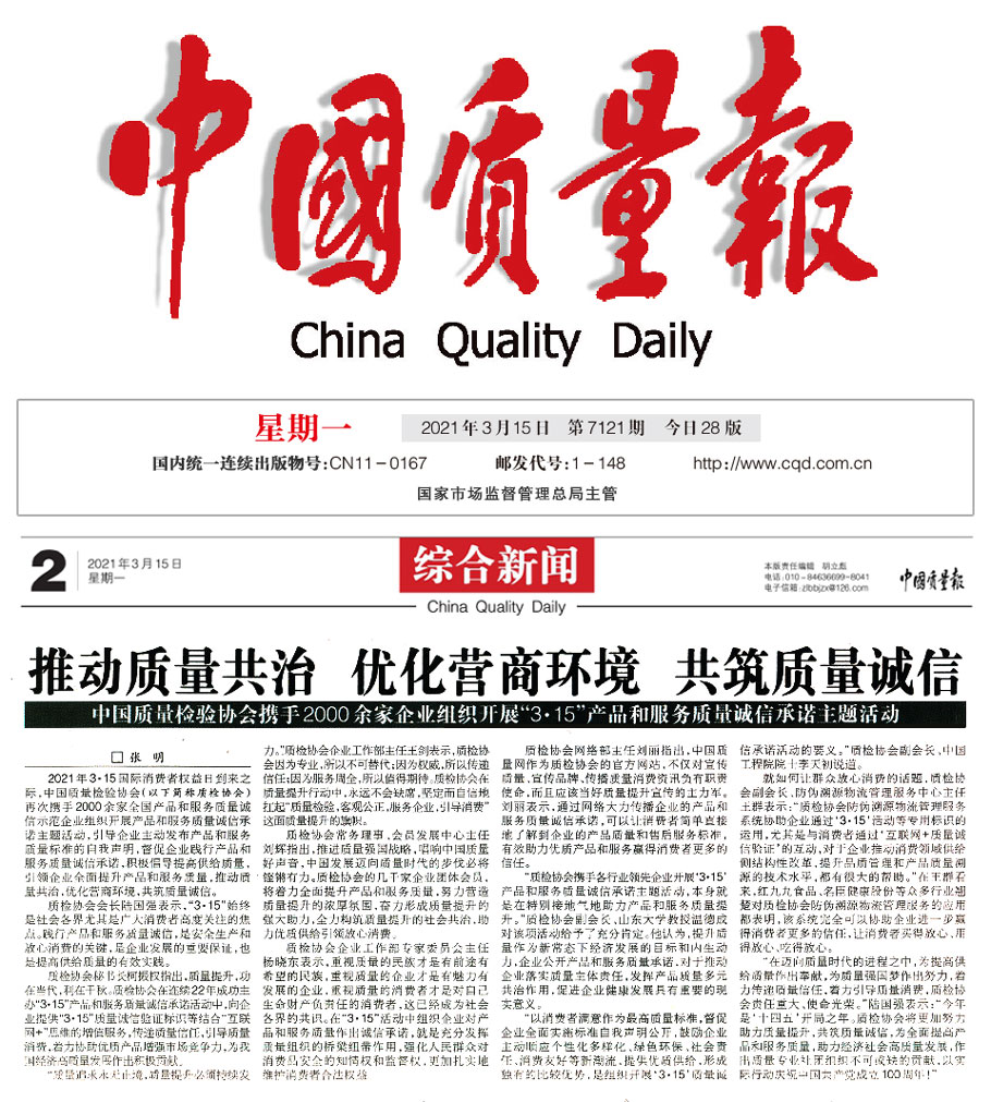 中國質量報(3月15日刊第2版):推動質量共治 優化營商環境 共筑質量誠信——中國質量檢驗協會攜手2000余家企業組織開展“3 ·15”產品和服務質量誠信承諾主題活動