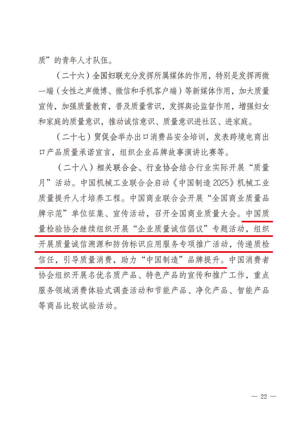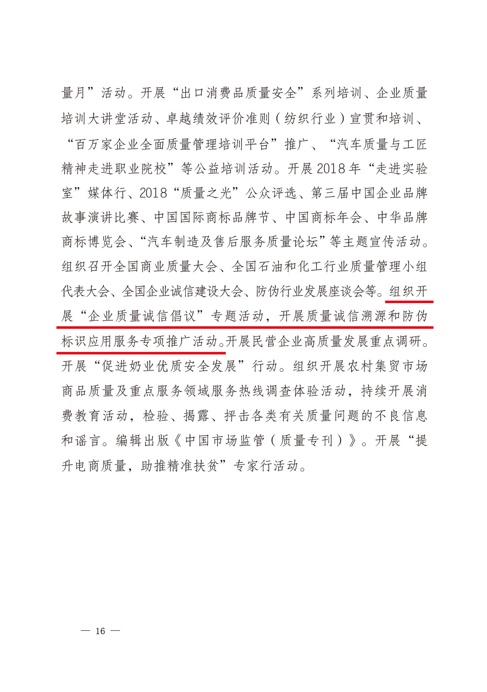 2016年8月15日,國家質檢總局、中共中央宣傳部、國家發改委、科學技術部、工業和信息化部、公安部、農業部、商務部、國務院國資委、國家工商總局、國家食藥監總局、國家知識產權局、中國貿促會等42個單位(部門)聯合印發的《質檢總局等關于開展2016年全國“質量月”活動的通知》(國質檢質聯〔2016〕437號)就曾重點安排部署:中國質量檢驗協會繼續組織開展“企業質量誠信倡議”專題活動,組織開展質量誠信溯源和防偽標識應用服務專項推廣活動,傳遞質檢信任,引導質量消費,助力“中國制造”品牌提升。