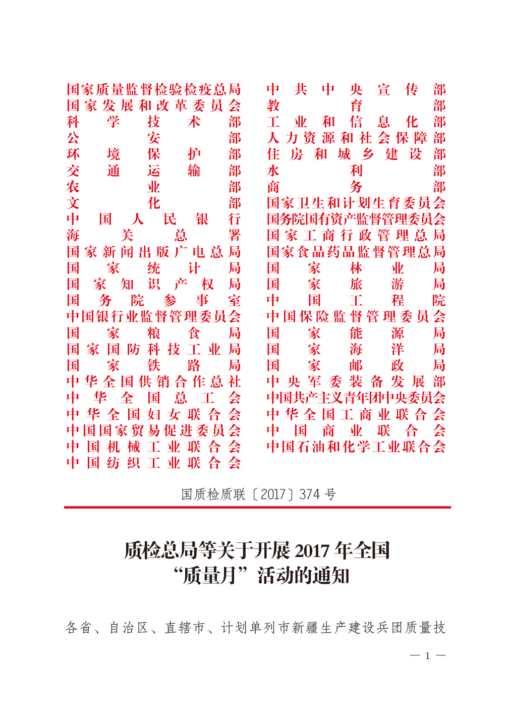 2017年8月23日,國家質檢總局和中共中央宣傳部、國家發改委、科學技術部、工業和信息化部、公安部、農業部、商務部、國家工商總局、國家食藥監總局等47個單位(部門)聯合印發的《質檢總局等關于開展2017年全國“質量月”活動的通知》(國質檢質聯〔2017〕374號)再次明確安排部署中國質量檢驗協會:繼續組織開展“企業質量誠信倡議”專題活動,開展質量誠信溯源和防偽標識應用服務專項推廣活動;同時,還將中國質量檢驗協會服務工作核心價值“傳遞質檢信任,引導質量消費”列入2017年全國“質量月”活動宣傳口號。