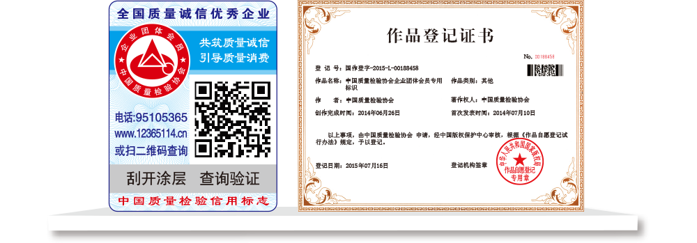 【“全國質檢穩定合格產品”專用標識】具有專屬的知識產權(經中國版權保護中心審核,國家版權局對“全國質檢穩定合格產品”專用標識頒發了《作品登記證書》,登記號:國作登字-2015-L-00188456),基本規格為5cm2,集電話電碼防偽查詢、二維碼在線掃描、微信驗證等多種功能于一體,綜合運用了紐索幣紋、微縮文字、熒光激發油墨等多種防偽技術;專用標識加貼在產品或包裝上,消費者只需要用座機(手機)電話撥打全國范圍內都不需要加區號的特服號碼95105365或使用手機掃描二維碼或登陸網站(http://www.12365114.cn)就可直接查詢驗證加貼專用標識的產品為中國質量檢驗協會調查匯總證明的全國質量檢驗穩定合格產品,助力企業通過“質量檢驗”的比較優勢去贏得消費者更多的信任,形成企業自己獨有的比較優勢。